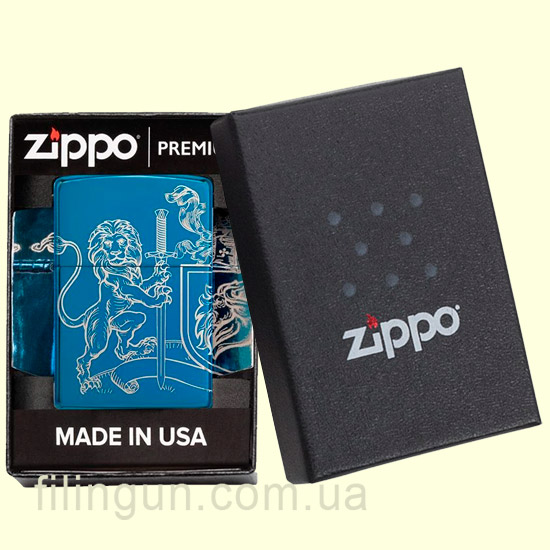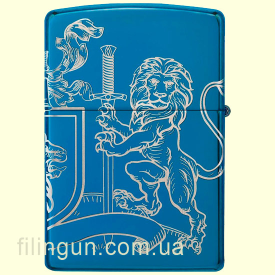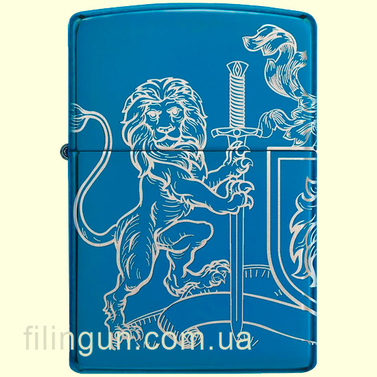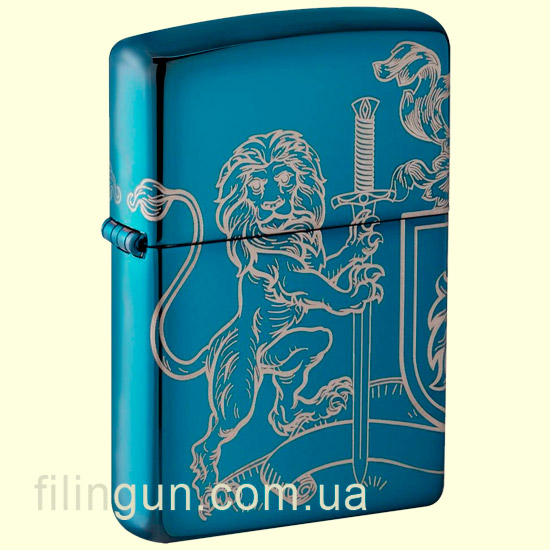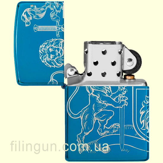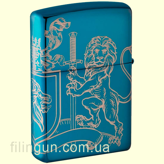 Бензиновая ветрозащитная зажигалка Zippo 49126 Medieval Coat of Arms Design High Polish Blue. Металлический корпус имеет глянцевую, зеркальную поверхность глубокого синего цвета. В обработке поверхности корпуса зажигалки применена запатентованная компанией, специальная PVD технология, придающая высокую стойкость поверхности к истиранию и появлению царапин. По всей поверхности корпуса методом круговой лазерной гравировки нанесено геральдическое изображение со щитом, львами и знаменами. Упакована в фирменную подарочную упаковку с логотипом Zippo. Для превосходной работы используйте только фирменное топливо Zippo.