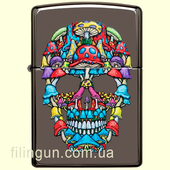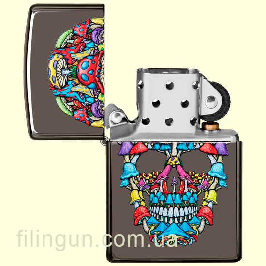 Бензиновая ветрозащитная зажигалка Zippo 49135 Mushroom Skull Design Black Ice. Металлический корпус имеет красивую темно-дымчатую, глянцевую поверхность. В обработке поверхности корпуса зажигалки применена запатентованная компанией, специальная PVD технология, придающая высокую стойкость поверхности к истиранию и появлению царапин. На лицевой стороне нанесено оригинальное изображение черепа созданного из разноцветных грибов. Упакована в фирменную подарочную упаковку с логотипом Zippo. Для превосходной работы используйте только фирменное топливо Zippo.