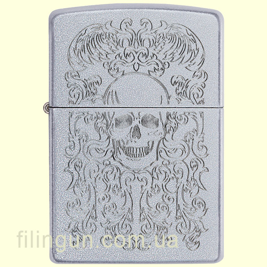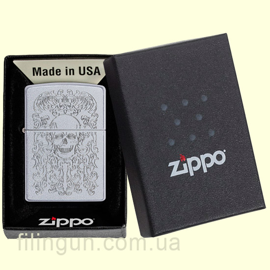 Бензиновая ветрозащитная зажигалка Zippo 49571 Skull Design Satin Chrome. Металлический корпус имеет матовое, приятное на ощупь, хромированное покрытие обработанное по технологии сатинирования (лощения) - благодаря чему на корпусе не остается следов от пальцев. На лицевой стороне методом лазерной гравировки нанесено изображение черепа на фоне витиеватого узора. Упакована в фирменную подарочную упаковку с логотипом Zippo. Для превосходной работы используйте только фирменное топливо Zippo.