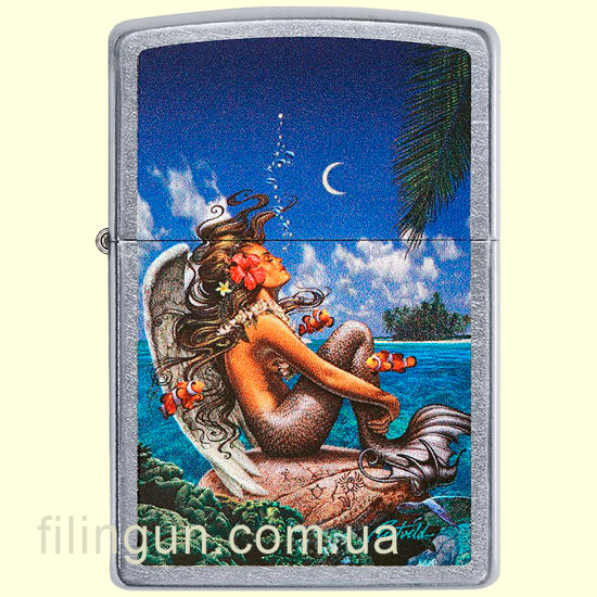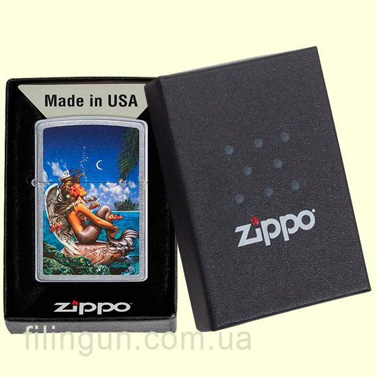 Классическая бензиновая ветрозащитная зажигалка Zippo 49688 Rick Rietveld Street Chrome. Металлический корпус имеет матовое, одно из самых не прихотливых, хромированное покрытие, на котором не остается следов от пальцев. На лицевой стороне нанесено красочное изображение русалки, отдыхающей на скале в тропическом раю - чудесный художественный дизайн сотрудничества Zippo и Рика Ритвельда. Упакована в фирменную подарочную упаковку с логотипом Zippo. Для превосходной работы используйте только фирменное топливо Zippo.