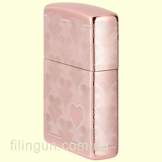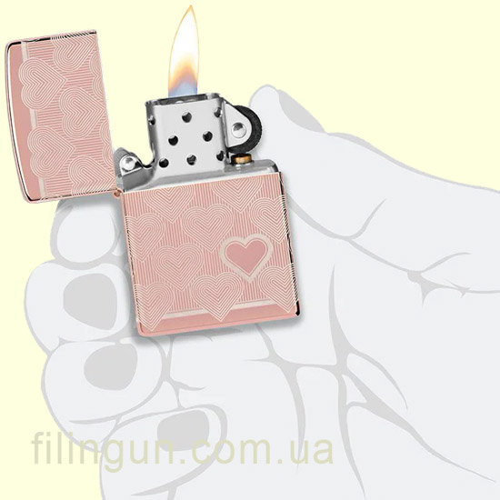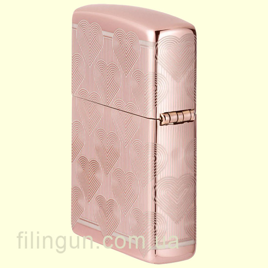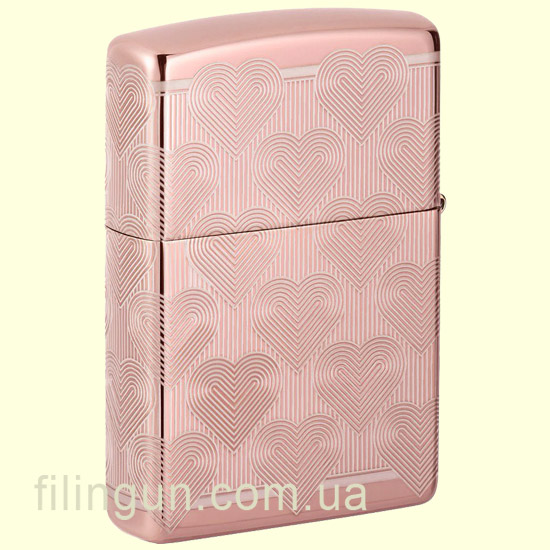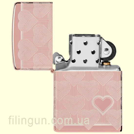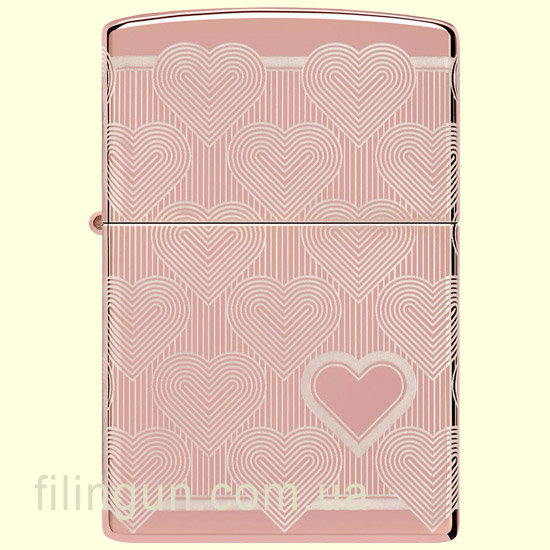 Бензиновая ветрозащитная зажигалка Zippo 49811 Heart Design High Polish Rose Gold - это не только практичное дополнение для курильщиков, но и стильный аксессуар известный своей высокой прочностью, качеством и надежностью. Зажигалка имеет прочный металлический корпус с утонченным и нежным глянцевым покрытием, цвета розового золота (High Polish Rose Gold). На всю поверхность, при помощи технологии Laser 360° нанесена гравировка в романтическом дизайне в виде повторяющегося сердца, с одним ярко выделяющимся на лицевой стороне.