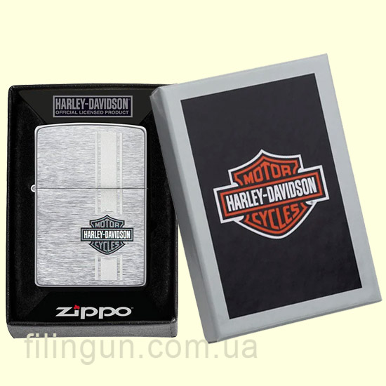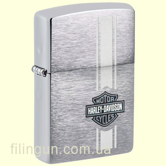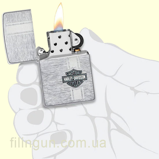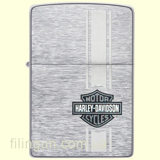 Классическая бензиновая ветрозащитная зажигалка Zippo 49828 Harley-Davidson Brushed Chrome - это зажигалка выпущенная Zippo в сотрудничестве с Harley-Davidson, вдохновленная дизайном мотоциклов и символикой компании. Металлический корпус имеет матовое серебристое (хромированное) покрытие Brushed Chrome, с тонкой горизонтальной текстурой на лицевой и обратной стороне. Зажигалка имеет изящный и сдержанный дизайн с изображением, на лицевой стороне, культового логотипа Harley-Davidson в виде полосы и щита с дополнительными деталями и текстурой благодаря процессам нанесения Color Image и Luster Etch.