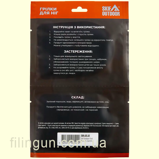 Skif Outdoor Foot Warmer – це зручний та ефективний засіб для підтримки тепла ваших ніг у холодні дні. Ця хімічна грілка є компактним пакетом, який активується при контакті з повітрям, надаючи тривале і приємне тепло. У кожному комплекті є дві грілки для ніг. Основні характеристики грілки для ніг Skif Outdoor Foot Warmer: Простота використання. Skif Outdoor Foot Warmer не вимагає додаткових пристроїв або джерел енергії. Просто розпакуйте грілку, активуйте її та помістіть у взуття для швидкого зігрівання ніг. Максимальна температура нагрівання сягає 53 °C. Тривале тепло. Ця грілка забезпечує тривалий час підтримки тепла, що особливо важливо у зимових умовах. Грелки Skif Outdoor Foot Warmer гарантують вашим ногам тепло та комфорт протягом приблизно 8 годин. Вона ідеально підходить для використання під час активних занять на відкритому повітрі, таких як лижі, снігоступінг чи просто прогулянки. Компактний розмір. Skif Outdoor Foot Warmer легко поміщається в кишеню, сумку або рюкзак, що робить її зручною для перенесення. Це чудове рішення для тих, хто часто перебуває в дорозі. Безпека. Грілка безпечна у використанні та не містить шкідливих хімічних речовин. Склад включає лише натуральні компоненти: залізний порошок, вода, вермикуліт, активоване вугілля та сіль. Її можна використовувати як дорослими, і дітьми. Skif Outdoor Foot Warmer - відмінне рішення для тих, хто цінує комфорт та тепло в холодні дні. Легка у використанні, компактна та ефективна, цей продукт стане надійним супутником у будь-якій зимовій поїздці. Не забувайте купити грілку для ніг Skif Outdoor Foot Warmer для приємного та теплого відпочинку на свіжому повітрі.
