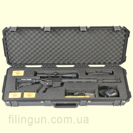 Кейс SKB для AR c аксесуарами 108х36.8х14 відноситься до серії 3i-3614. Кейс має водонепроникний корпус, виготовлений з понад міцного матеріалу під назвою polypropylene copolymer (кристалічний сополімер поліпропілену) з міцної водостійкої і пилезащитной конструкцією (MIL-C-4150J), стійкою до корозії і ударним пошкоджень. Замикається кейс за допомогою чотирьох запатентованих засувок, які обладнані петлями, з нержавіючої сталі, для замків. Також для зручності перенесення кейс SKB обладнаний трьома прогумованими ручками, розташованими з боків, а в нижній його частині присутні роликові колеса. Оболонка кейса від компанії SKB стійка до впливу ультрафіолетових променів, корозії, розчинників, грибка по стандарту (MIL-STD-810F), має високий ступінь захисту від пошкоджень і ударів по стандарту (MIL-STD-810F), а також має автоматичний клапан вирівнювання тиску (MIL-STD-648C).