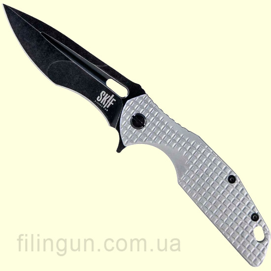 Наш інтернет магазин радий запропонувати вашій увазі ніж Skif 423D Defender GRA/Black SW, Grey. Створений для самозахисту тактичний складаний ніж Skif Defender послужить хорошим доповненням і як любителям активного відпочинку, рибалкам і мисливцям, і як повсякденний ніж для міста. Скіф Захисник 423D - ніж фліппер, що дозволяє відкривати його одним рухом як правої, так і лівої руки. Багатофункціональний клинок завдовжки 9,7 см і товщиною в 3 мм має зручну підпальцеву виїмку, а рельєфні насічки на рукояті забезпечать надійне утримання навіть якщо рука в маслі або забруднена. Нержавіюча сталь марки 8Cr13MoV з чорним матовим покриттям клинка Black Stonewash, має гарну корозійну стійкість, відмінно тримає заточку і легко правиться. Механізм блокування клинка Frame Lock, забезпечує надійність фіксування в робочому положенні. Комбінована, ергономічна рукоять виконана з сірого анодованого алюмінію з одного боку і анодованої нержавіючої сталі з іншого. Також варто відзначити наявність зручної односторонньої знімної кліпси і збільшеного темлячного отвору.