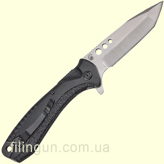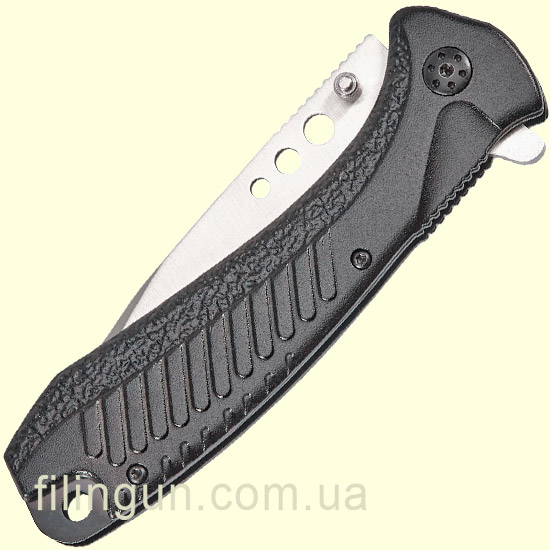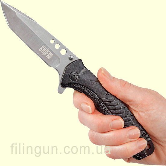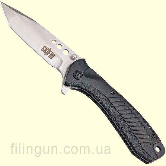 Складаний ніж Skif Plus Holed має клинок формою Tanto point з товщиною обуха 3,6 міліметра та виготовленого з нержавіючої сталі марки 3Cr13. Рукоятка має яскравий цікавий дизайн і виготовлена з алюмінієвого сплаву також є кліпса для перенесення ножа навіть у кишені штанів та отвір для темляка. Замок використовується Liner-Lock, а за допомогою двостороннього шпенька та фліппера виріб можна швидко привести до робочого стану.