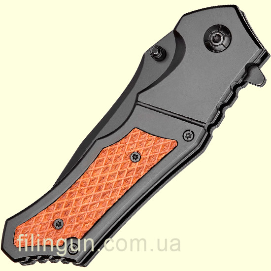 Ніж Skif Plus Mate Wood Black має рукоятку, виготовлену з алюмінію зі вставкою із дерева з дрібними насічками на лівій накладці. Сама ж рукоятка має яскраво виражені під пальцеві виїмки. Універсальна форма клинка, підійде як для носіння і застосування в міських джунглях, про що говорить і сама назва ножа Mate, так і на природі. Клинок має матове покриття, а одностороння кліпса дозволить закріпити ніж на ремені. Замок використовується Liner lock, а за допомогою двостороннього шпенька і фліпером, а також системи Assist (підпружинений клинок) виріб можна швидко привести в робочий стан.