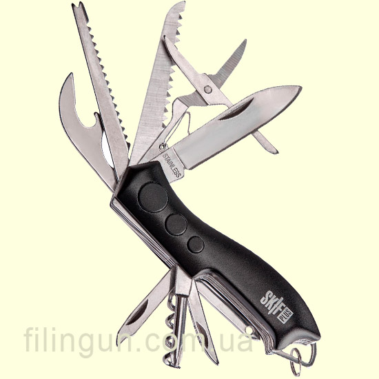 Багатофункціональний ніж Skif Plus Wavy Black це корисний невеликий девайс, який допоможе вам у найскладніших ситуаціях, з якими ви можете зіткнутися. Виготовлений з нержавіючої сталі марки 420 і має довжину 9,6 см та вагу всього 114 грам. Накладки виготовлені з алюмінієвого сплаву з анодуванням із пластмасовими вставками.