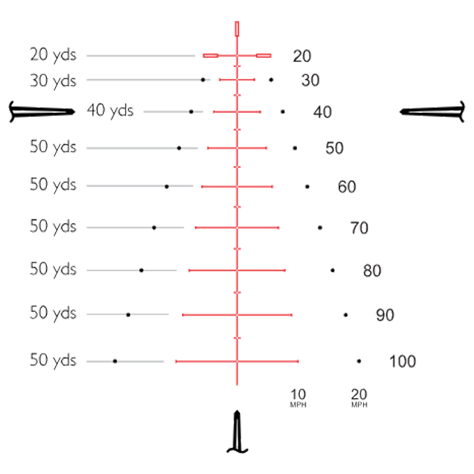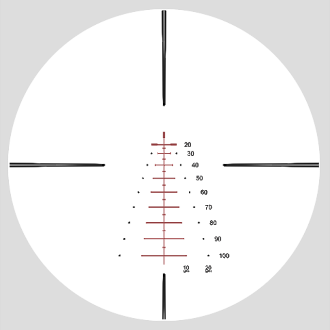 Прицільні точки від 20 до 100 ярдів з інтервалом 5 ярдів. Точки прицілювання на 10 ярдів включають смуги та точки корекції бічного вітру зі швидкістю 10 та 20 миль на годину.