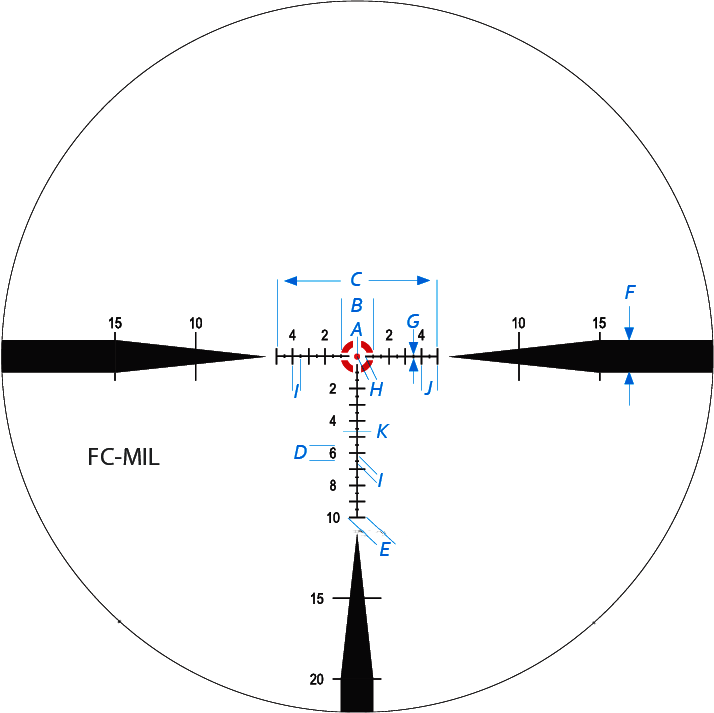 Прицільна сітка FC-MIL підходить для тих, хто воліє працювати з метричною системою вимірювань та використовувати корекції у частках мілірадіану.