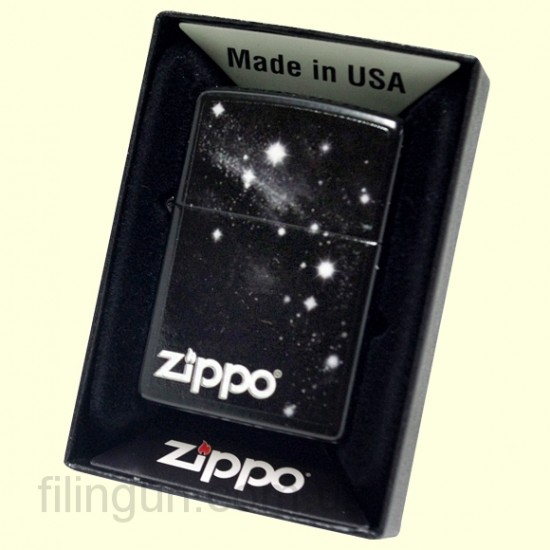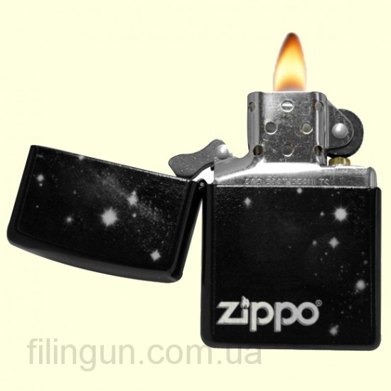 Класична бензинова запальничка Zippo 28058 Galaxy Licorice Matte. Металевий корпус має чорне покриття кольору лакричної карамелі, стійке до подряпин і стирання. На лицьовій стороні зображення галактики. Запальничка Zippo запакована у фірмову подарункову коробочку з логотипом Zippo.