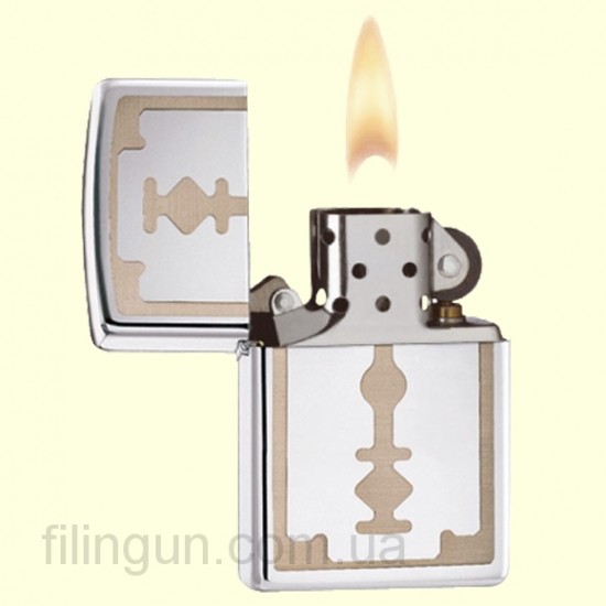 Класична бензинова запальничка Zippo 28137 Razor Blade High Polish Chrome. Металевий корпус має глянсове хромоване покриття. На лицьовій стороні зображення леза бритви. Запальничка Zippo запакована у фірмову подарункову коробочку з логотипом Zippo.