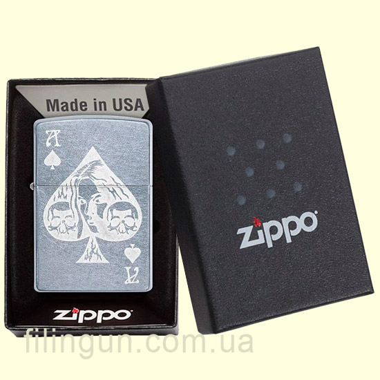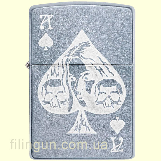 Класична бензинова вітрозахисна запальничка Zippo 49113 Ace of Spades Goth Street Chrome. Металевий корпус має матове, одне з не вибагливих, хромоване покриття, на якому не залишається слідів від пальців. На лицьовій стороні методом імпринтингу нанесене оригінальне зображення пікового туза - карти смерті, в якій промальовується жіноче обличчя між двома черепами. Упакована у фірмову подарункову упаковку з логотипом Zippo. Для чудової роботи використовуйте тільки фірмове паливо Zippo.