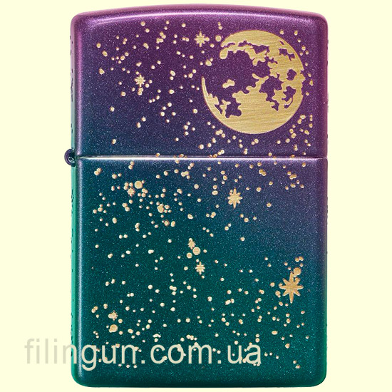 Zippo 49448 виконана в унікальному кольорі, що переливається, нагадує нічне зоряне небо. Дизайн Starry Sky виконаний з використанням лазерного гравіювання, що створює зірки, що переливаються, на всіх чотирьох сторонах корпусу. Завершує композицію яскравий повний місяць, що гордо розміщений на кришці, а на боці без петель сяє полум'я Zippo, доповнюючи атмосферу зоряної ночі. Цей ефект додає запальничці неповторну естетику, яка підійде як для особистого використання, так і стильного подарунка. Корпус виготовлений із міцного металу, що забезпечує довговічність та стійкість до зносу.